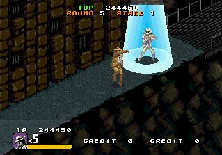 街机版<月亮步>大概是除MD版外,唯一一部值得一玩的杰克逊游戏了,不过它比MD版还要差点.本作的类别介于射击游戏与动作清版游戏之间,幸运的是,MD版的绝大部分出彩要素都被沿用.默认值下,按住开火按钮可以放出电荷杀死敌人.你依然可以引诱敌人跳舞,只不过这次不再耗费你的生命槽,而且还能通过营救小孩获得补充.当你找到Bubbles后,你会变身为一个机器人,换用导弹与激光来消灭敌人。本作采用了传统了斜45度视角,同时可三人同玩(2p和3p分别是穿着红色与黑色西装的杰克逊).游戏中很多关卡的主题都是重复的,只是顺序稍微有点变化.乐曲也有很多重复,可品质并没有多少提升.毫无疑问,这是画面最好看的一部杰克逊游戏.游戏在不经意间流露出不少闪动之处,每关一开始,都配有几幅有趣的漫画桥段,以及一幅标有所有人质方位的地图.在一些场景里,迈克尔还会向Mr.Big发出他那标志性的WOOO~吼声,就像狗在对敌人狂吠般——类似的场景在MD版中也曾出现过.迈克尔转变为机器人形态的过程看了让人直起鸡皮疙瘩——首先,迈克尔的身体会增大成一个巨大的畸形体,然后变为金属,再然后缩为标准尺寸.只是"需要找到Bubbles才能变身"这样的设定本身似乎并没有多少道理.有意思的是,到达墓地后,Mr.Big会?鲆痪渚镆舨裳某胺砘坝?"我真的太爱你了,迈克尔!"