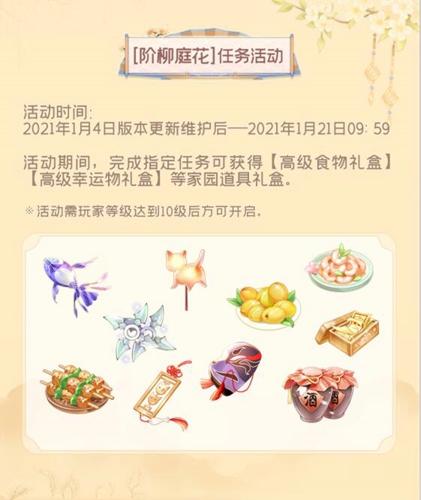 活动期间,完成指定任务可获得【高级食物礼盒】【高级幸运物礼盒】等家园道具礼盒。活动需玩家等级达到10级后方可开启。活动时间:2021年1月4日版本更新维护后——2021年1月20日23:59