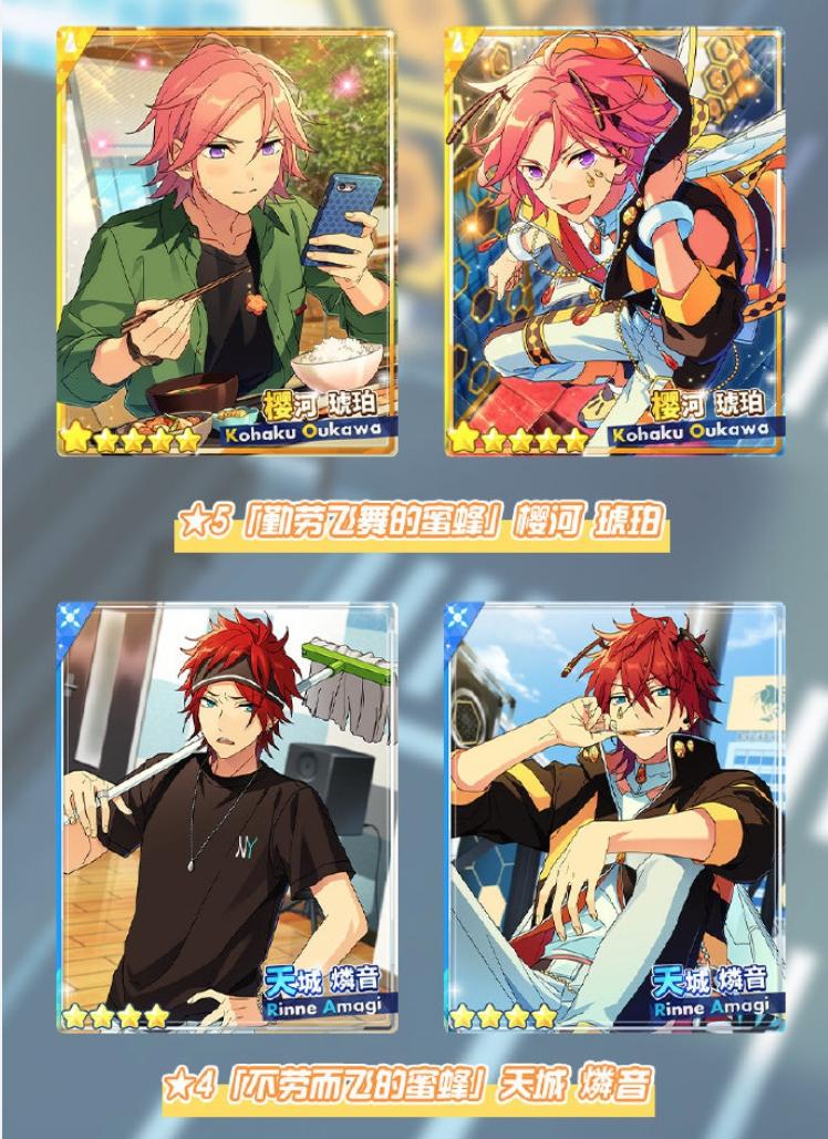 2021年1月1日12:00-1月15日11:59,全新限定卡池「招募!飞舞蜜蜂」正式开启!★5【勤劳飞舞的蜜蜂】樱河琥珀、★4【不劳而飞的蜜蜂】天城燐音、★3【空腹飞舞的蜜蜂】椎名丹希、★3【观察飞舞的蜜蜂】HiMERU,四张活动卡牌在活动卡池掉率提升!将活动卡编入队伍,也会获得「心灵交错/汽车展览会」演唱会活动的加成。