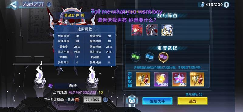 首先说无尽之井,矿洞就不说了,老玩家资源都更得上,无尽之井是获取新装备碎片的唯二之地,15星能15星陨也是稳赚不亏,所以无尽之井必是以后玩家消遣体力的绝佳之地,,但是!想要刷井的同学注意了,将近30%的暴击抵抗!金鬼完全废了有没有?经本人测评,暴击率+4白泽暴击着实有限,十回合暴击一次已谢天谢地,修罗帝俊更是比金鬼帝俊输出高[嗒啦啦2_优秀]