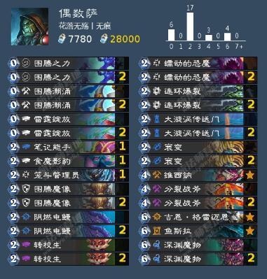 奇数萨:小劣,起手留牌衰变和电鳗(电鳗在这个对局真的超级重要)基础留牌图腾buff,深渊魔物,分裂战斧,蠕动的恐魔,雷霆绽放。对局过程中,因为奇数萨解牌密布,前期很难站住场面可以加攻buff不要立刻交,加血buff两个随从就可以加了,打奇数萨最好把随从血量控制在三到四血以上,防止前期闪电风暴,中期法强闪电风暴。站住场面,随从血量安全再打脸。