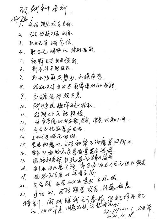 让人欣喜的是,在收集玩家建议的过程中,我们能深切感受到玩家的参与热情,其中一位ID为“罪”的玩家更是手写了一份建议书,让我们在字里行间,感受到玩家流露出的真切诉愿: