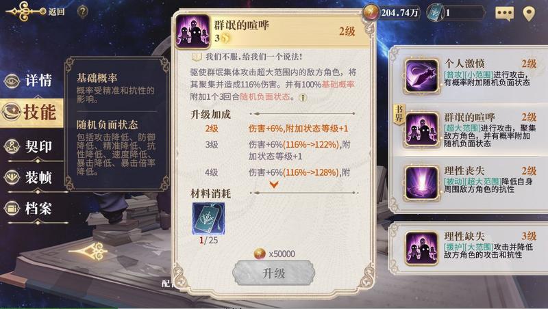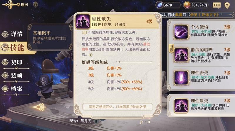 最后他的援护技能可以让敌人无法获得正面状态,这在PVP中非常强力,如果你的队伍抢到了先手,这个技能可以让对方的所有援护和辅助全部失效。因此《群体心理》卡俄斯也是游戏中必练的平装幻书。