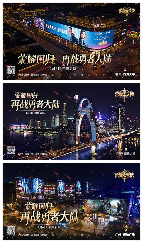 广州猎德大桥、绿轴广场、杭州西湖,也同样有着华丽酷炫的魔幻视觉大秀;在《荣耀大天使》公测人气持续创新高之际,与代言人迪丽热巴、孙红雷强强联合缔造的这场“荣耀盛典”人气进一步走向高峰!