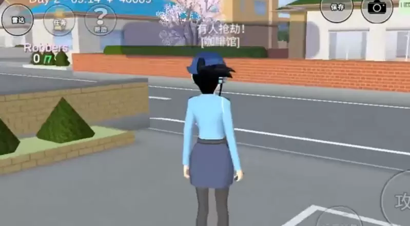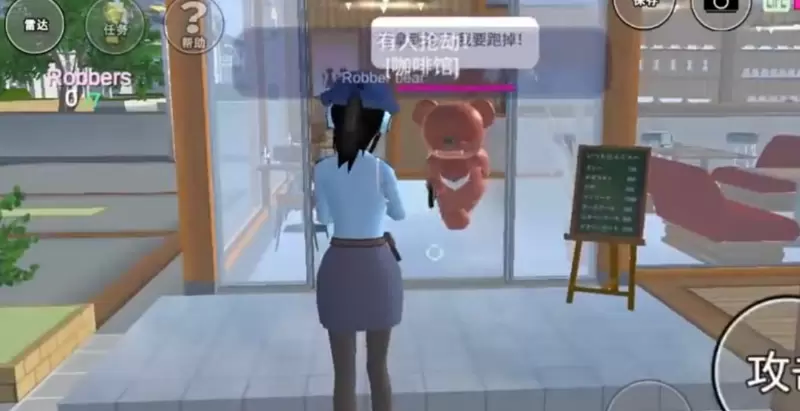 1、在樱花校园模拟器中,玩家换上警服之后,过一会在右上角就会出现任务了,点开任务后会知道强盗熊在抢劫,打败他后就可以获得金钱;