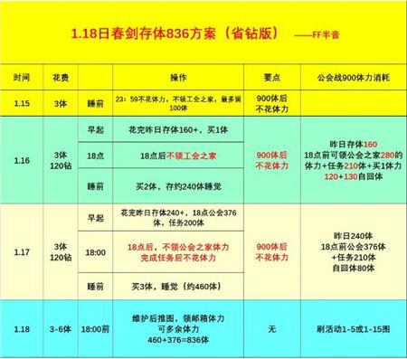 其实每日3体也可以完成春之剑圣,所以即使存体不花钻买4-6体力,也可以通过省体力等操作为春剑存体。注:这是简略版,就不整太多了,天天推算那种还是算了。