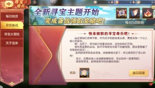 接见信使后,开启寻宝备战任务。每日完成讨伐魔将、家园互动、群雄逐鹿等玩法条件即可获得司隶藏宝图碎片及刻印石、好感度宝箱、精炼石等奖励。