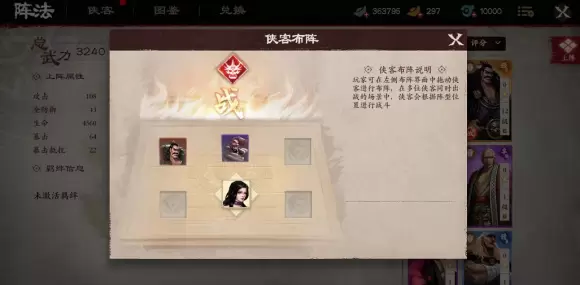 已获得的侠客更是能够加入阵法中,大幅度提升自身战力,对战斗有着非常大的作用。玩家也可以使用道具对侠客进行升级,进一步提升侠客的相关属性。侠客的获取和布阵,是游戏中提升战斗力最为关键的一环!