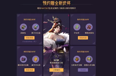在《三国杀Online》十二周年资料片更新之前,进行预约操作,免费获得晋·张春华、五阶直升宝箱、稀有将印宝箱、精致皮肤包等诸多福利豪礼,邀请好友参与资料片预约的小伙伴,还可额外解锁招募令宝箱、周年欢庆秀宝箱、周年泡泡永久权等福利大奖。