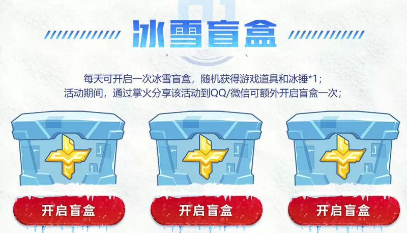 1、在活动期间,每天都可以打开冰雪忙盒(一天一次),分享该活动到QQ和微信APP,可以额外开启一次冰雪盲盒。