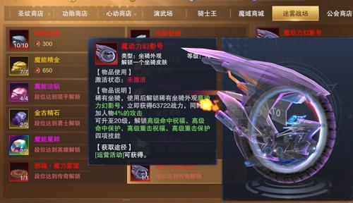 迷雾战徽可在迷雾战场商店自由兑换稀有道具。一些特殊专属道具,需要玩家在赛季内达到一定段位才能获得,尤其是酷炫的“魔动力幻影号”坐骑,是给予传奇段位的专属奖励,千万可别错过了。