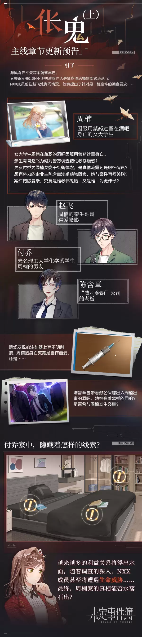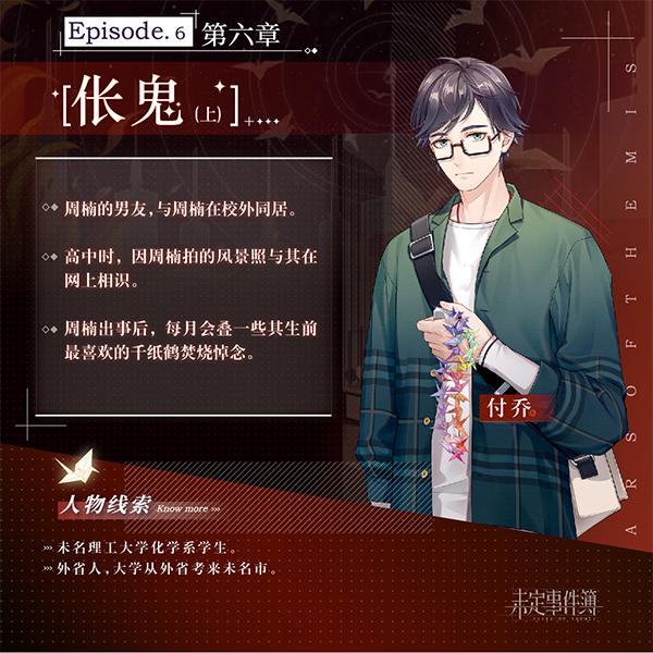 主线第六章《伥鬼》开启在即,《未定事件簿》陆续释出了赵飞、付乔、陈含章三人的人物介绍,为玩家提供了相关人物线索的部分案件背景信息,引起了玩家对人物关系和案件走向的诸多猜测。