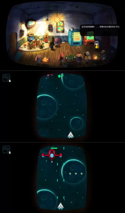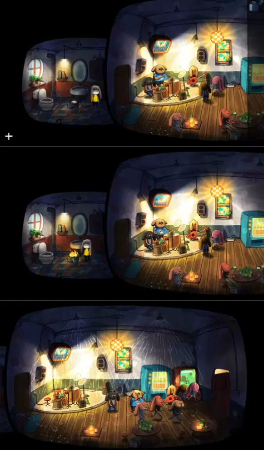 进入后,点击左边游戏机,通关小游戏,获得一个游戏币,然后投入旁边的售货机,获得香烟,然后与左下角的兔子对话,得知他要烟,于是把烟给他,然后等他点燃香烟以后,取走打火机,然后与旁边的鼓互动(小游戏),之后打鼓的兔子会给我们一个铁桶