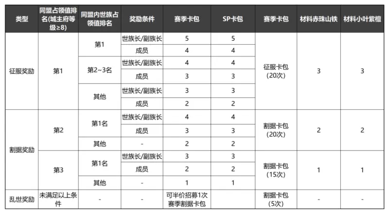 本赛季中,各个世族结成同盟竞逐天下。赛季结算时将根据各个同盟的占领值来进行最终奖励的结算。同盟之间排名决定征服、割据及乱世的奖励名次,同盟内部的各个世族同样以世族所获得的占领值进行排名,决定细分的奖励档次。