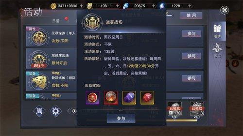 通过参与迷雾之战玩法可以获得积分,积分决定段位的高低,每次段位提升都能获得一次对应段位的奖励,每赛季结束后可获得对应段位的限时称号,迷雾之战奖励,包括称号·不朽诸神、金古精石、金古灵石。