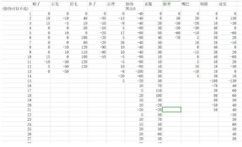上图中,横轴是捏脸部位,纵轴是选择项,中间的值是相对于初始值的变化