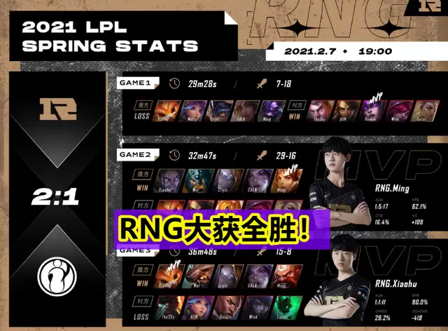 而结果也是没有让那些支持RNG的粉丝们失望,虽然开局被IG拿下了一份,但是RNG众人却并没有因此放弃,直接连扳两局,直接“让一追二”拿下了IG,尤其是小明和小虎,也是在这两场比赛里面发挥出色。