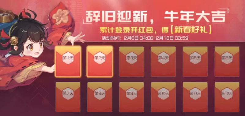 2月6日04:00-2月18日23:59,每日登录即可获得红包一个!连续签到还有额外奖励哦!连续签到6天,获【春节主题气泡】;连续签到 10 天,获【春节主题头像框】;连续签到12天,获 【时装通用7折券*1】!