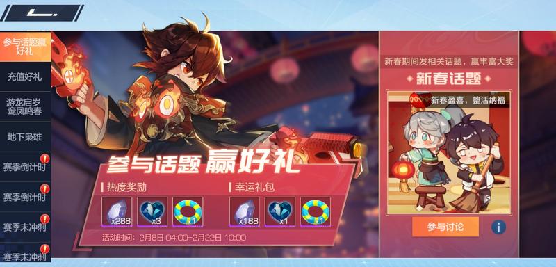 2月8日04:00-2月22日03:59,新春盈喜,整活纳福。参与【春节话题】即有机会获得新年好礼!