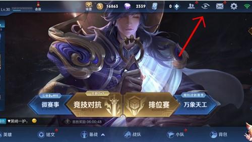 1、点击主界面右上方的【观战】功能,就是下图红色箭头所指的图标;