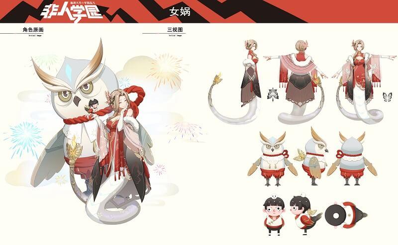 薄纱披肩上,裹着洁白的皮草,黑色下摆轻轻披散,正好抵御这乍暖还寒时节料峭的春寒。女娲灰白的尾部,末端还装饰着赤铜对蝶,一团火焰燃烧,更平添几分温暖。巨大鸟型傀儡也化身成灰白的夜枭,毛羽高高扬起双目炯炯有神,紧跟并守护在女娲身旁。