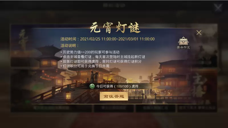 参与活动,每日都可以获取100虎符奖励,同时,每答对一道灯谜,即可获取元宵积分,用于兑换元宵专属的限时外观,包括聊天气泡、头像框等,用于主公装点自己的势力。