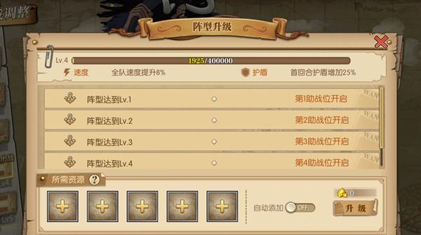阵型升级之后将会开放抗敌之阵的助战位置,并且诶提升速度加成和首回合护盾的数值。
