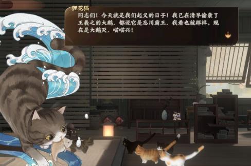 喵居的猫咪聚在一起为最近喵居的小鱼干太少而发起了起义,王羲之的大鹅便是他们起义的号角。