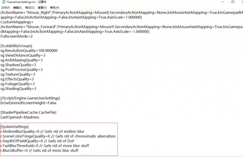 找到Engine.ini和Gameusersettings.ini 在这两个文件的底部添加这些代码,保存后重启游戏