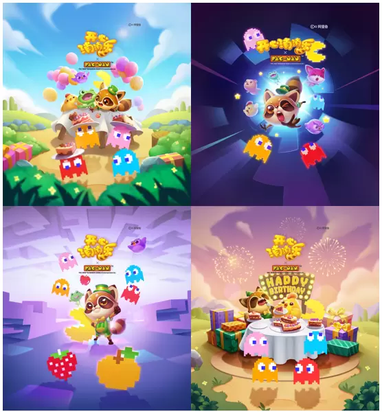 本次联动活动的海报也趣味非常,玩家们可一通过这四海报串联出一个完整的小故事:幽灵们携带蛋糕窜逃,小动物则在后方追逐抢糕大盗;小动物们来到了街机风格十足的吃豆人的星球;小动物和吃豆人携手闯关,打败幽灵夺回蛋糕;小动物与吃豆人共同庆祝生日趴。趣味剧情与游戏元素巧妙贴合,浓厚的生日氛围让玩家乐在其中!