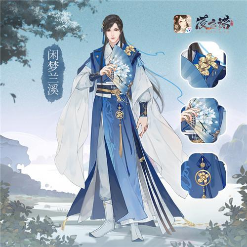鹤叫空庭霜月小,夜来冻云如晓。小巧金饰搭配宝蓝色流苏,靛青衣袍显身形,鱼白劲袖丝锦织造,尽显飒爽英姿。碎金花饰点缀于肩头,与腰间的雕花吊坠竞相怒放。一把折扇绘尽尘世繁华,花开正盛人潇洒,好一个翩翩公子。