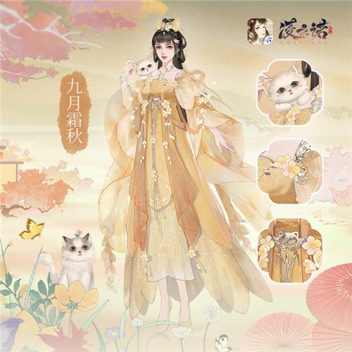 窟边痴坐费工夫,侧辊横眠却自如。携素雪狸猫,名唤团团,乐享闲暇光阴。发髻轻垂系金簪发冠,轻纱布料作成精心裁剪的荷叶边,款式新颖娇俏可爱。丝缕霓裳染橙晕,娇花坠饰惹人怜,一副不谙世事的天真少女模样。