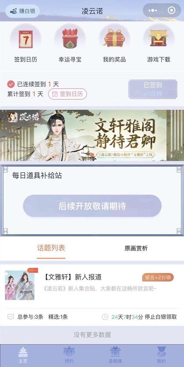 文轩雅阁,静待君卿。绮丽国风社交手游《凌云诺》专属微信小程序今日正式上线。诸位君卿可以关注《凌云诺》微信公众号点击按钮入口“文雅轩”或在微信小程序界面搜索“文雅轩”进入小程序,每日签到、幸运寻宝以及白银集市等多样精彩功能等待体验,完成活动任务参与兑换还有丰厚奖励等你来拿,玩转国风尽享福利。