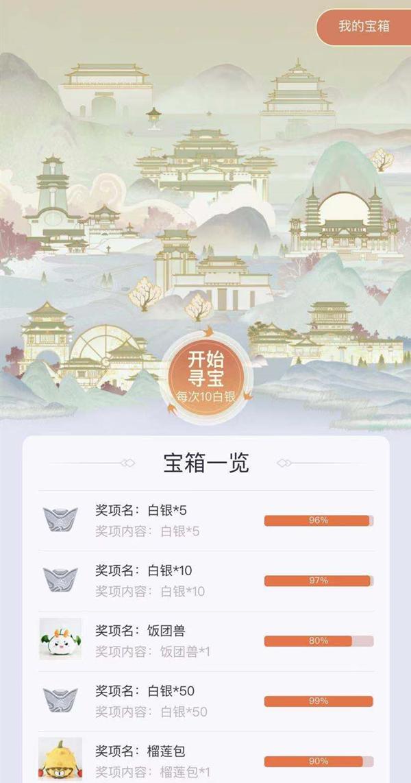 除了“凌烟楼”的福利兑换,也可以通过“幸运寻宝”中一试自己的运气。寻宝需要通过消耗“白银”参与寻宝抽奖,奖池中包含了大量礼包道具周边等奖励,同时还有几率获取大量“白银”作为奖励,后续还会持续更新奖池,能否“一发入魂”就要看各位君卿们的时运了。