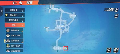 宝藏位置还是很容易发现的,因为给出的线索中有个椰子树,并且云海还有沙滩,那么符合这个位置的就是空岛了,同学们直接前往空岛地图的最下面,可以看到天使海滩。