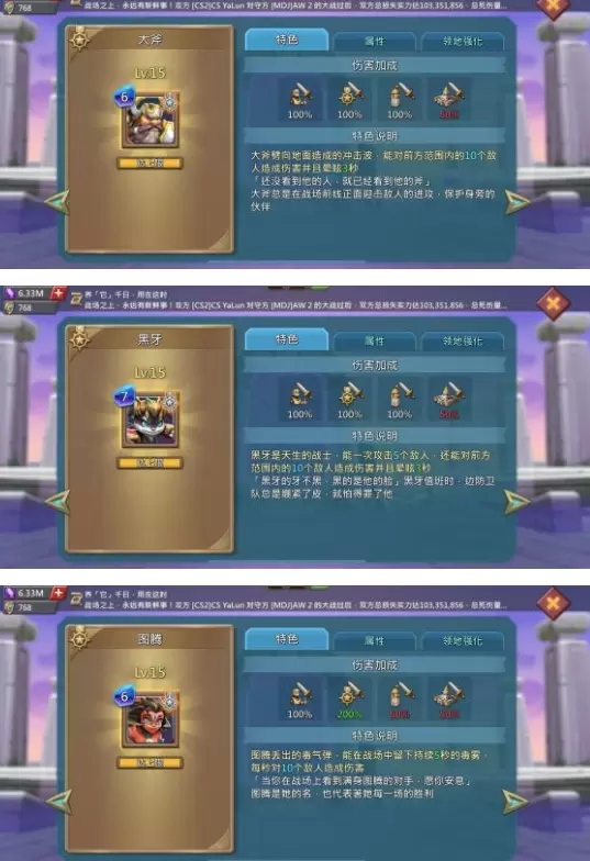 肉盾英雄和输出英雄我主要用的下面两位,后期把大斧换成了黑牙,图腾是非常核心的英雄,清对面的英雄主要靠他,可以看见他面板对英雄伤害是200%的,而且远程的脆皮容易活,不像铠甲虽然也是有加成但是冲上去就死。