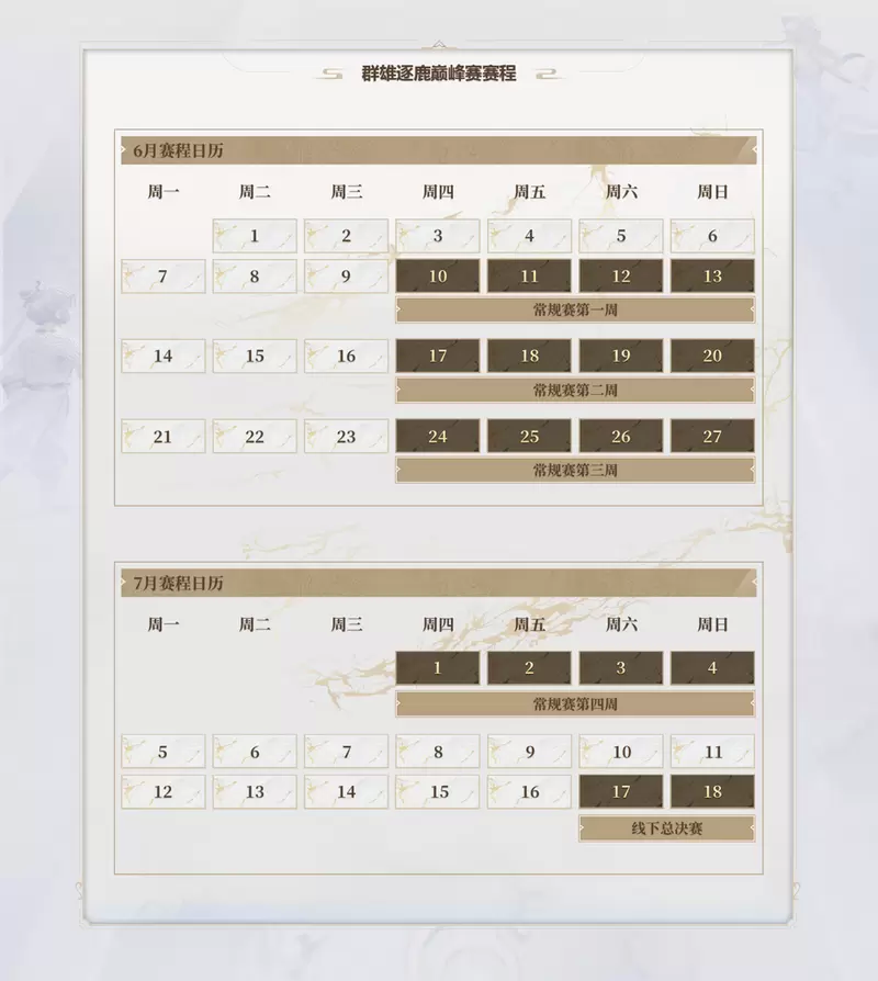 群雄逐鹿巅峰赛采用全新职业电竞赛制,以职业制作水准为广大参赛选手与观众提供最佳的赛事平台。巅峰赛每年将举办两届,每届比赛又分线上常规赛与线下总决赛两个部分。首届巅峰赛将于今年6月10日至7月4日率先进行为期4周的线上常规赛,每周紧凑进行多达14场双循环积分赛,足以令观众大饱眼福,酣畅淋漓地围观巅峰高手的决战!线上常规赛积分前4的队伍将获得进入线下总决赛的资格,并通过7月16日至7月18日三天残酷的BO5单败淘汰赛,角逐出最终的冠军队伍!冠军队伍将代表着全服最强的战力,拥有全服最高的荣誉和奖励!