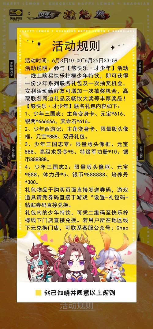 在浪漫的盛夏和绵绵的南风里,第五个616少年节终于要来啦!今年的少年节我们的少年系列产品(《少年三国志2》、《少年三国志》、《少年西游记》、《少年三国志:零》)与国民快乐茶饮品牌快乐柠檬将于6月3日正式开启破界联动。本次联动活动中,少年们不仅可以体验到定制快乐柠檬少年特饮,还有机会在参与活动之后免费领取少年游戏礼包和豪华畅饮福利。果茶创新组合,少年尽享一夏!