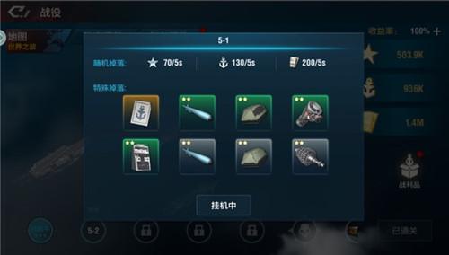 然后每一关的关卡挂机奖励也不要错过,特别是某些关卡中会有特殊掉落,能产出航母、护卫舰之类的船体碎片,如果对这类型的物资需求量比较大可以选择单独挂机这种关卡。