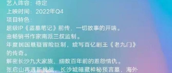 老九门2几月几号上映?老九门2最近已经开始正式筹拍了,但目前没有更多信息,很多粉丝都想知道这部热门剧的正式上映时间,接下来就和小编一起来看看官方的相关公告吧!