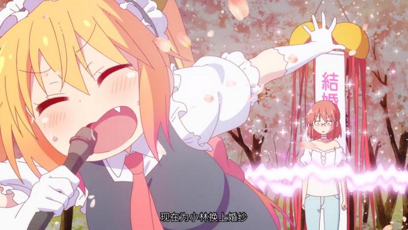接着托尔用魔法直接让小林换上了婚纱,看过龙女仆都知道托尔平常换衣服直接用魔法变的,所以变个婚纱轻而易举,而小林被突如其来的一幕搞蒙了,不是说欣赏樱花吗,怎么变成结婚了!