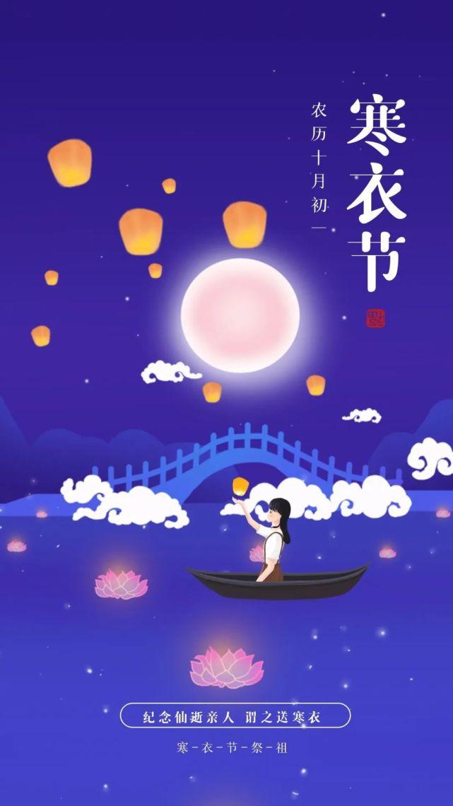 寒衣节:又称十月朝、祭祖节。农历十月一是寒衣节,这一天意味着严冬的到来,人们不仅要祭奠祖先,为他们“送寒衣”。也要为父母爱人等所关心的人,送御寒衣物,用温暖为所爱的人,抵挡这世界的寒凉风霜。