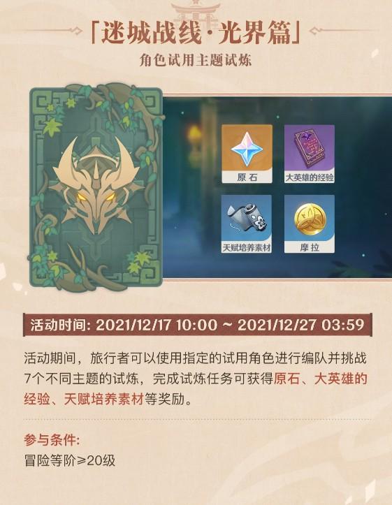 活动期间,旅行者可以使用指定的试用角色进行编队并挑战7个不同主题的试炼,完成试炼任务可获得原石、大英雄的经验、天赋培养素材等奖励。