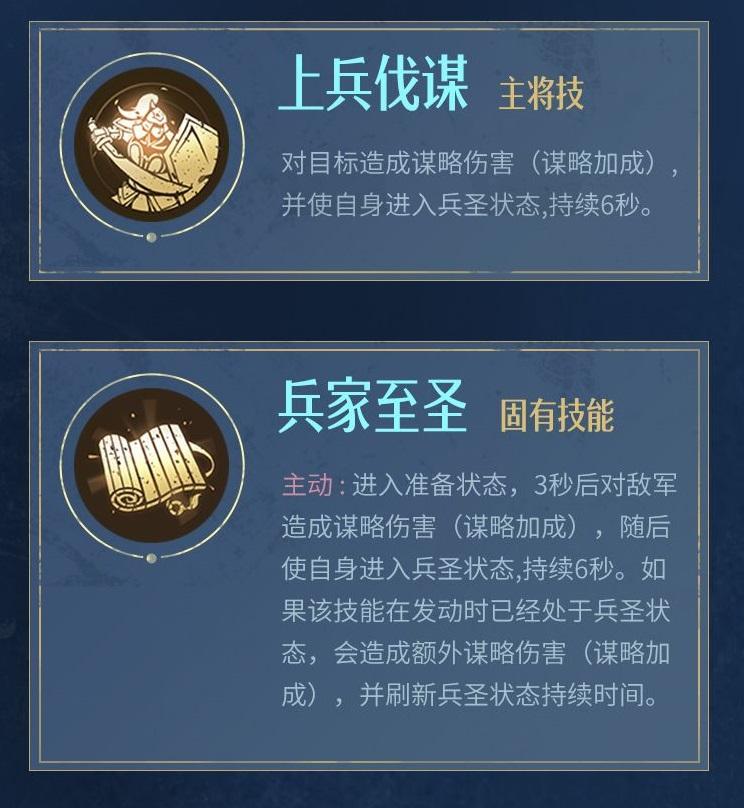 主动:进入准备状态,3秒后对敌军造成谋略伤害(谋略加成),随后使自身进入兵圣状态,持续6秒。如果该技能在发动时已经处于兵圣状态,会造成额外谋略伤害(谋略加成) ,并刷新兵圣状态持续时间。