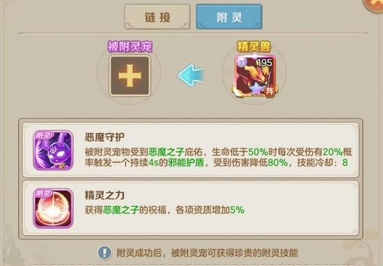 附灵,精灵兽可附灵到任意宠物上,被附灵宠将获取2个附灵技能,附灵状态可以随时解除。