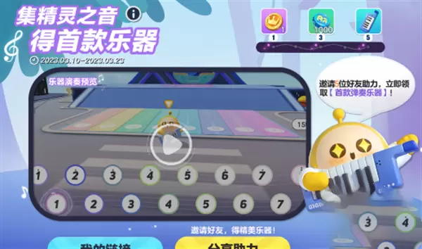 3月10日至3月23日,活动期间邀请5位好友助力,即可获得首款弹奏乐器【初学者电子琴】