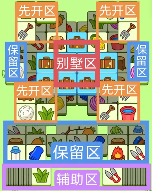 一个方形大别墅,开局先消除橙色区,然后按照一层层均匀消除表面牌,哪里压牌比较多就先消除哪里,必要时可以用盲盒区辅助消除表面牌,尽量还是以别墅区内互相消除为主,蓝色区基本都是明牌,全部保留到后期使用。