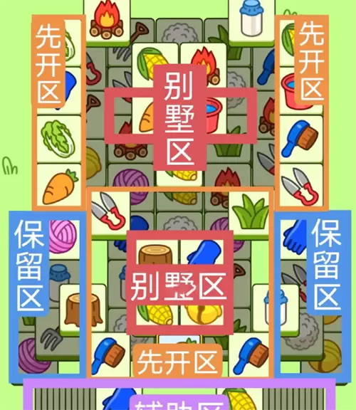 一个十字型大别墅,一个方形大别墅,可以用缝隙看牌法探底牌,开局先消除橙色区,然后按照一层层均匀消除表面牌,哪里压牌此较多就先消除哪里,必要时可以用盲盒区辅助消除表面牌,尽量还是以别墅区内互相消除为主,蓝色区有叠牌,但是不多, 全部保留到后期使用。