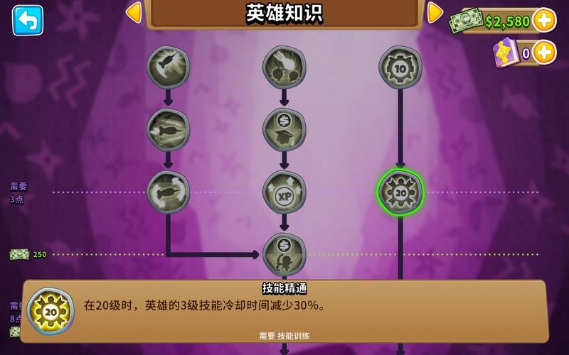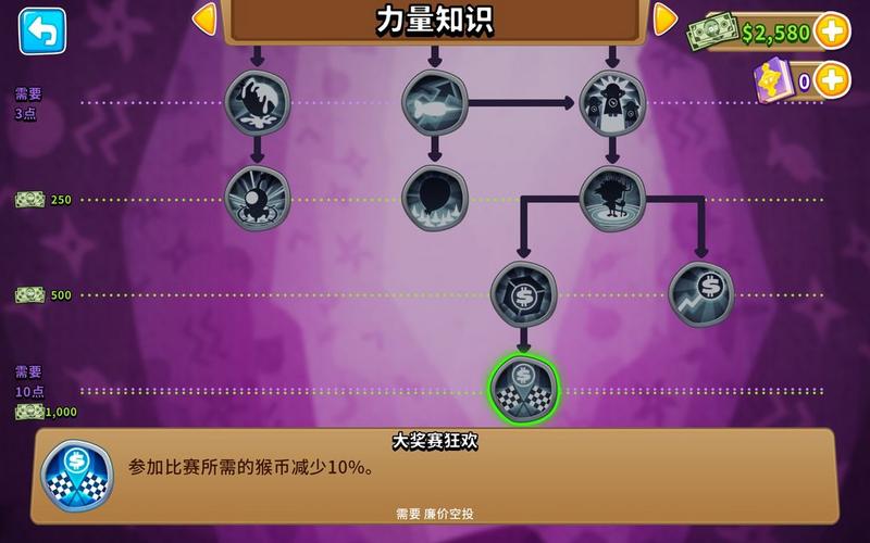 拥有3点知识点后,优先把【更多猴币】点出来。猴币可以买英雄、可以续关、可以买力量,并且后期加点也需要大量猴币。魔法猴的其它知识点玩哪个点哪个就行,或者点完【更多猴币】之后,先去点别的类别知识。