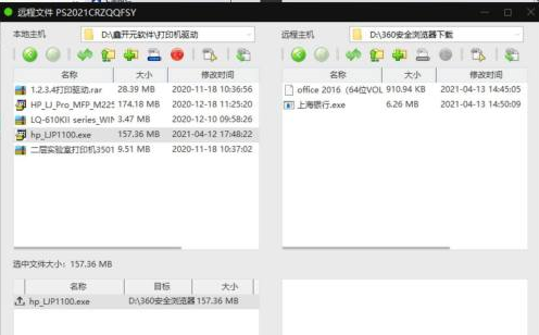 进入远程文件界面后,左侧显示本地文件,右侧显示远程办公电脑的文件。您可以轻松拖拽文件进行传输。